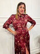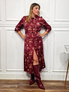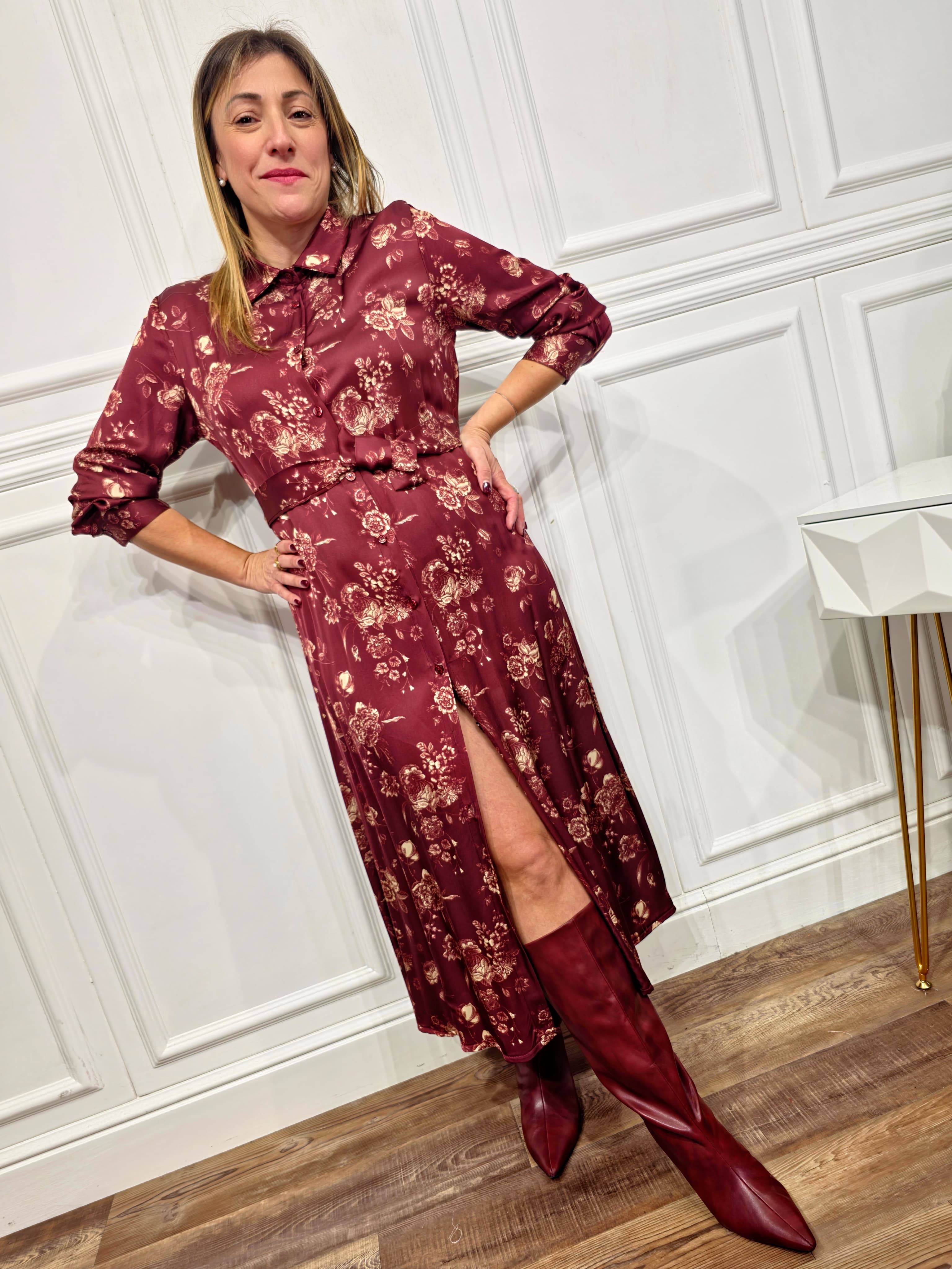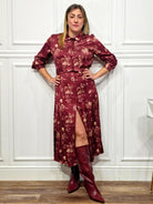 Un modello elegante e femminile, perfetto da indossare sia di giorno che di sera. L’abito chemisier presenta una chiusura con bottoni frontali, un colletto camicia e una cintura coordinata nello stesso tessuto che valorizza il punto vita. La stampa floreale su base bordeaux aggiunge un tocco sofisticato e romantico.