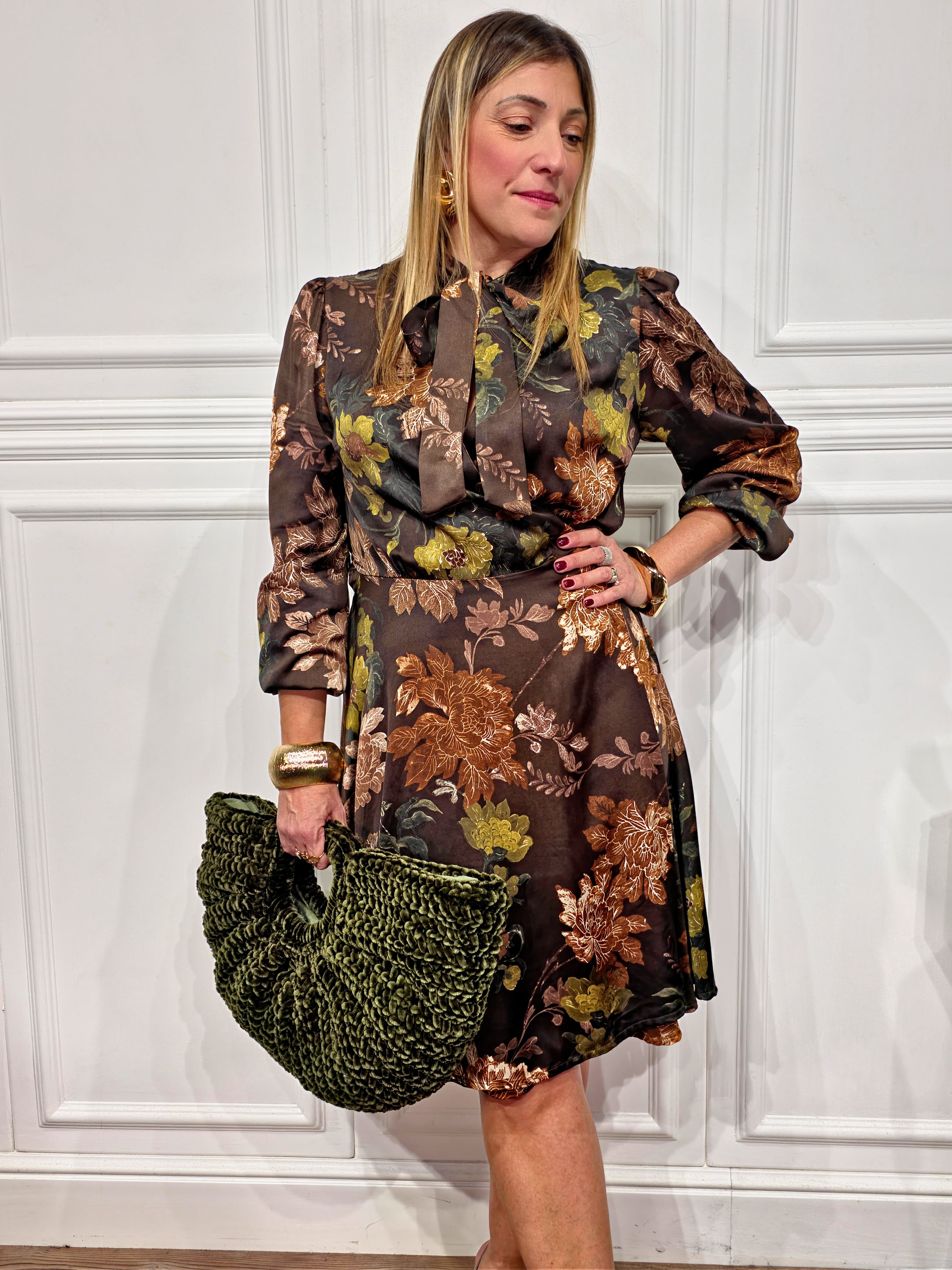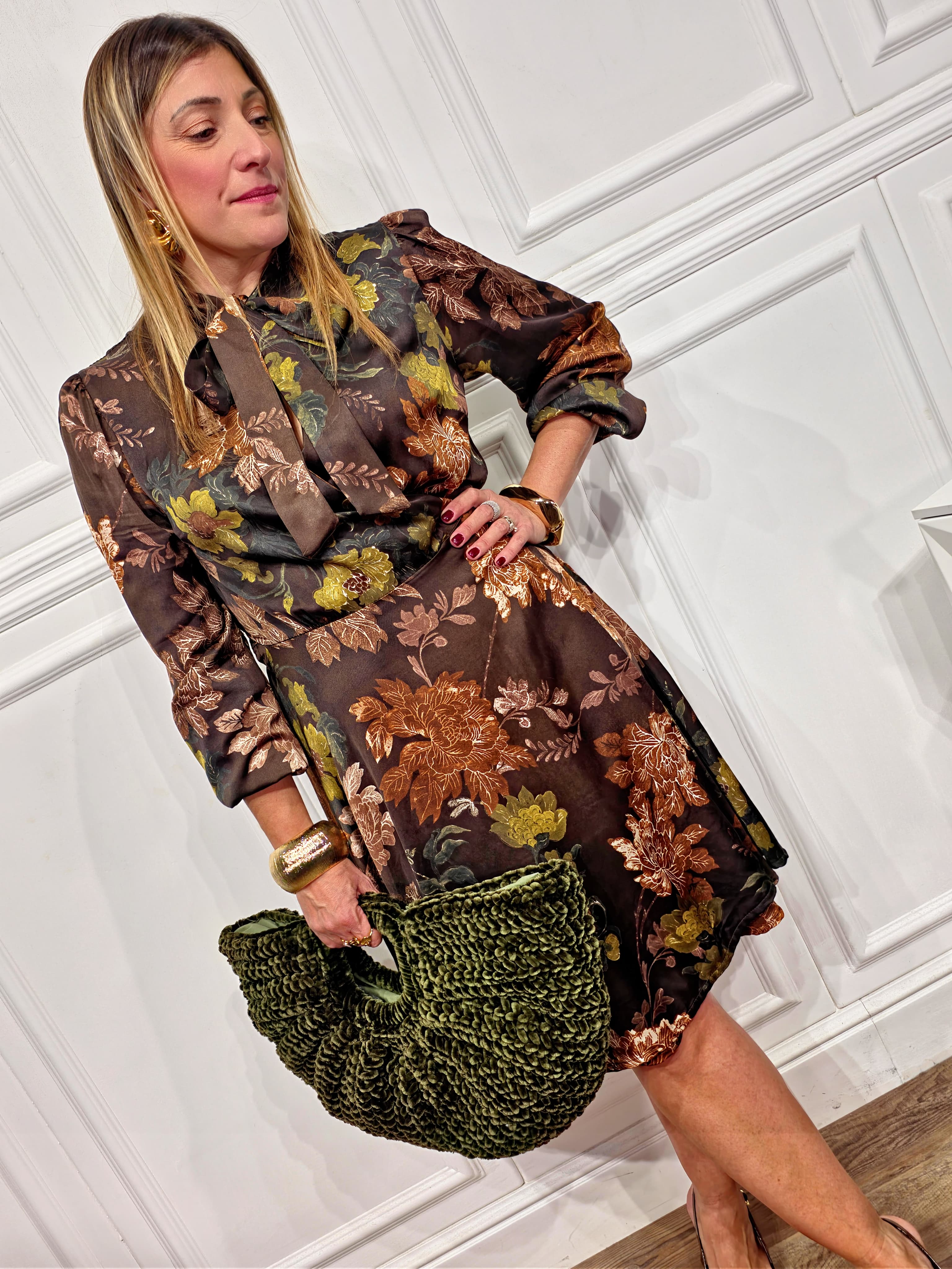 Abito in viscosa con scollo a punta e dettaglio fiocco al collo. Il modello a portafoglio valorizza la silhouette con eleganza e comfort, ideale sia per il giorno che per la sera.