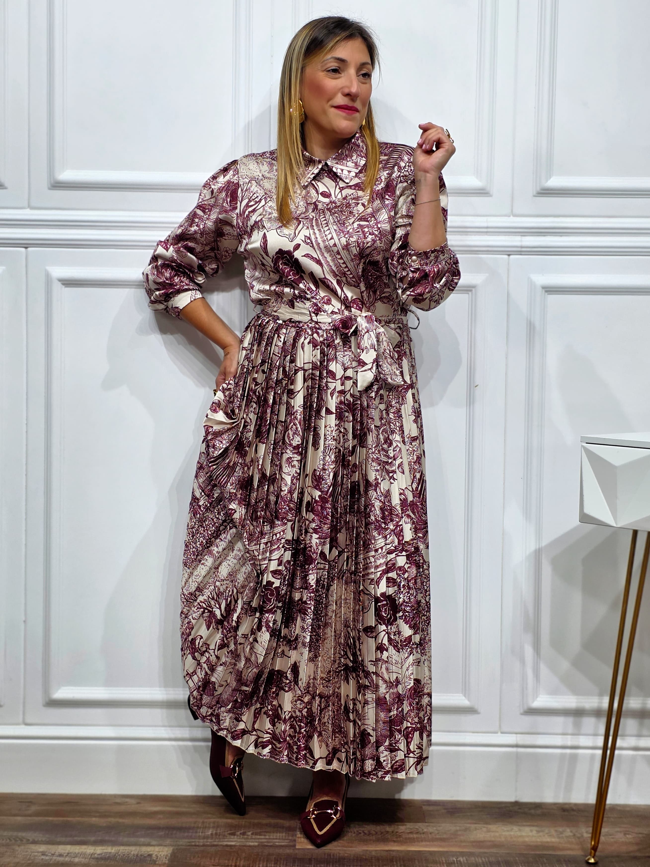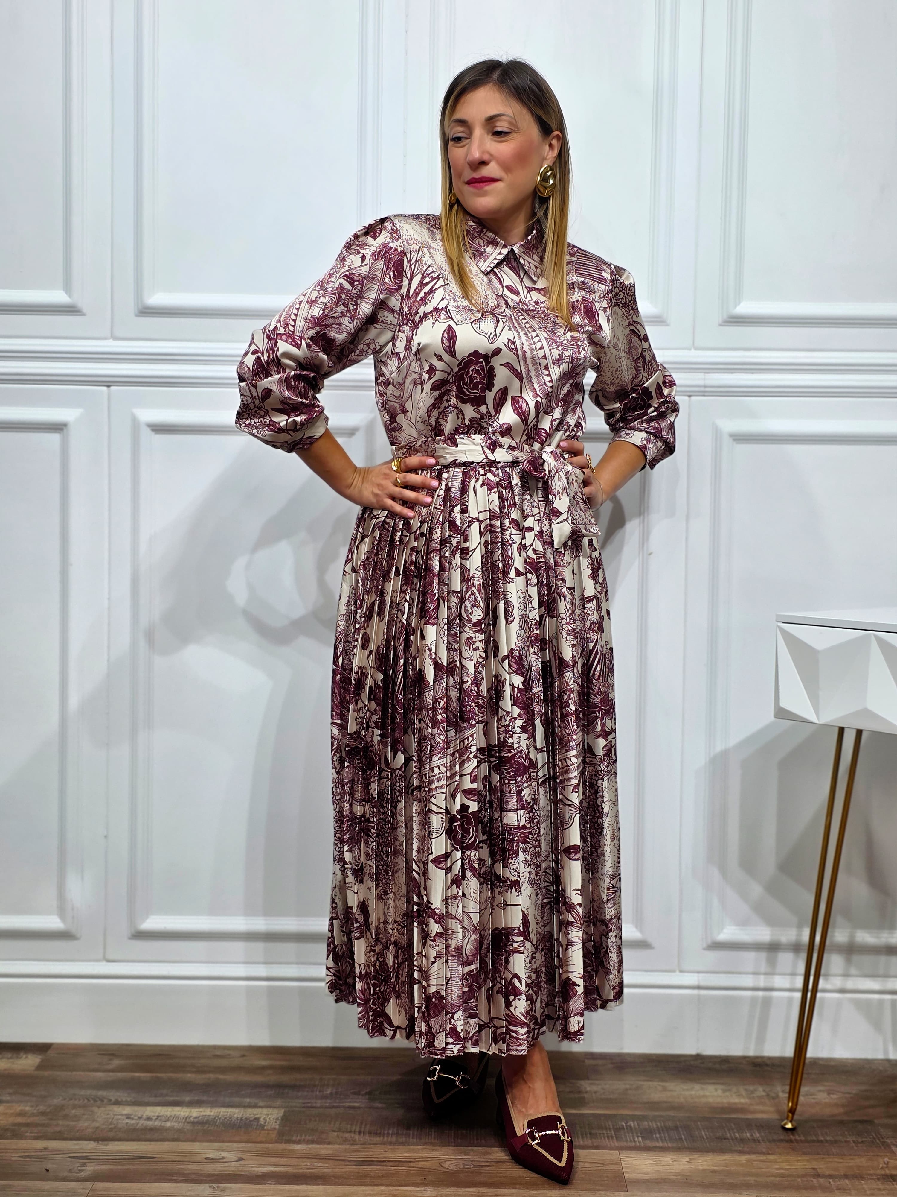 Abito lungo in viscosa con colletto classico, maniche lunghe e gonna plissettata che dona movimento e femminilità al look. La fantasia floreale bordeaux su base avorio regala un’eleganza senza tempo, mentre la cintura nello stesso tessuto sottolinea delicatamente il punto vita.