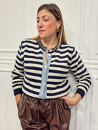 Cardigan paricollo rigato con bottoni effetto madreperla