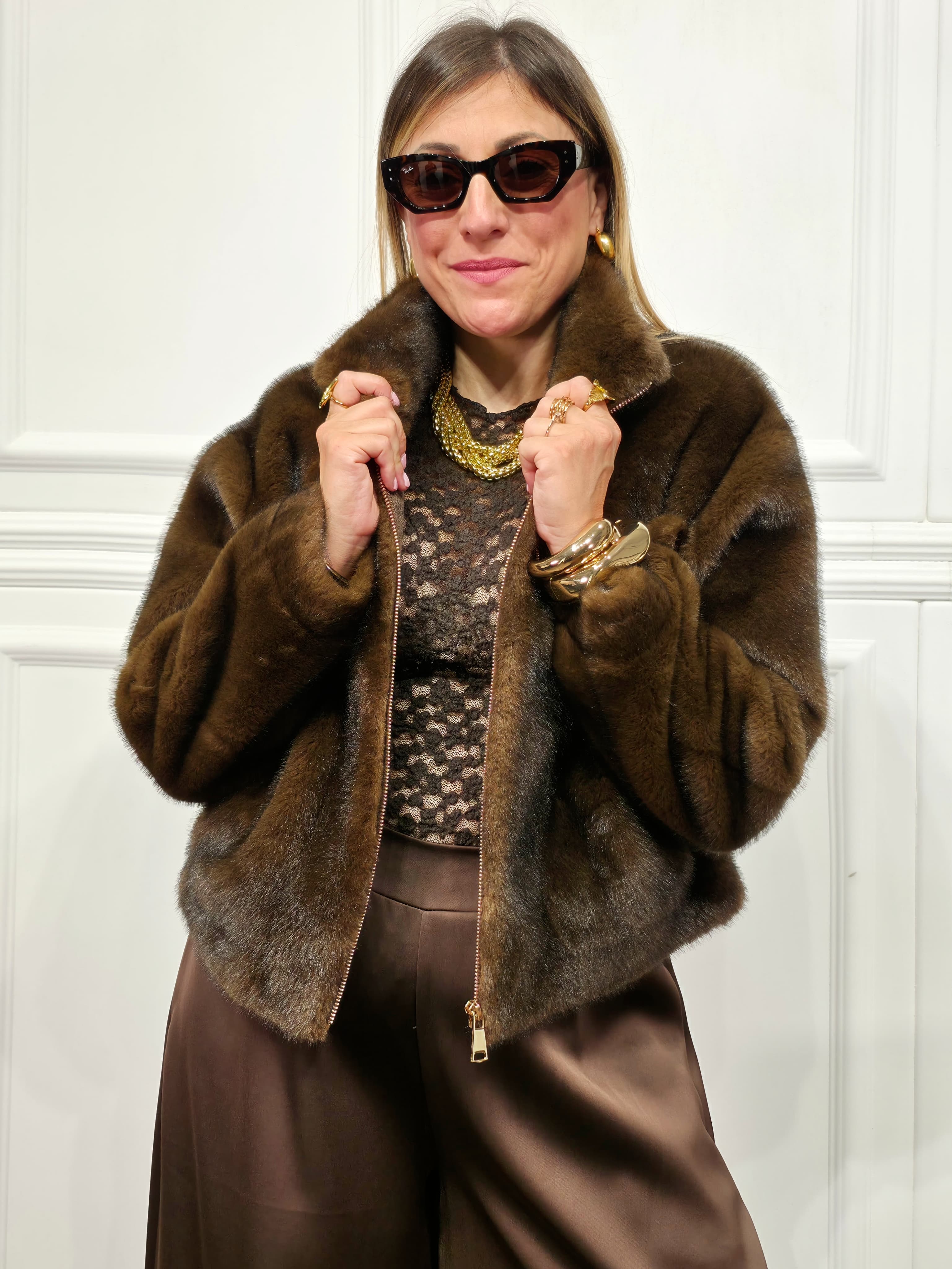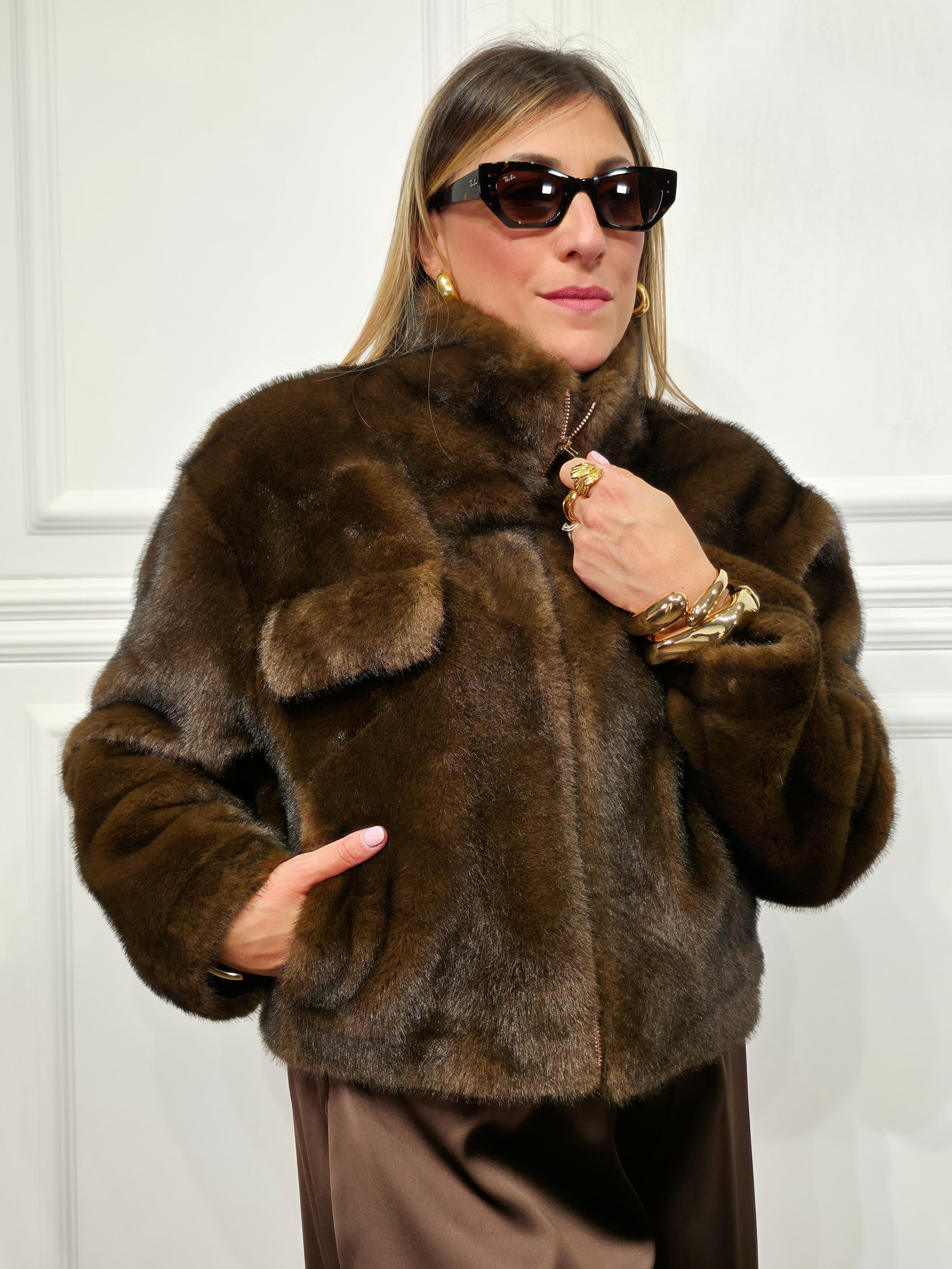 Giacca bomber in morbidissima ecopelliccia effetto visone, con zip frontale e ampie tasche applicate sul petto.