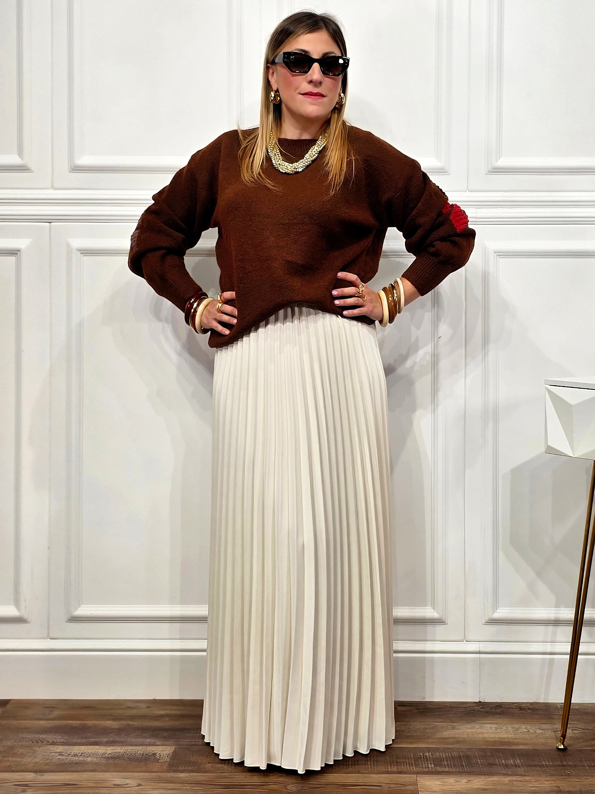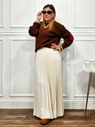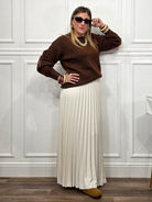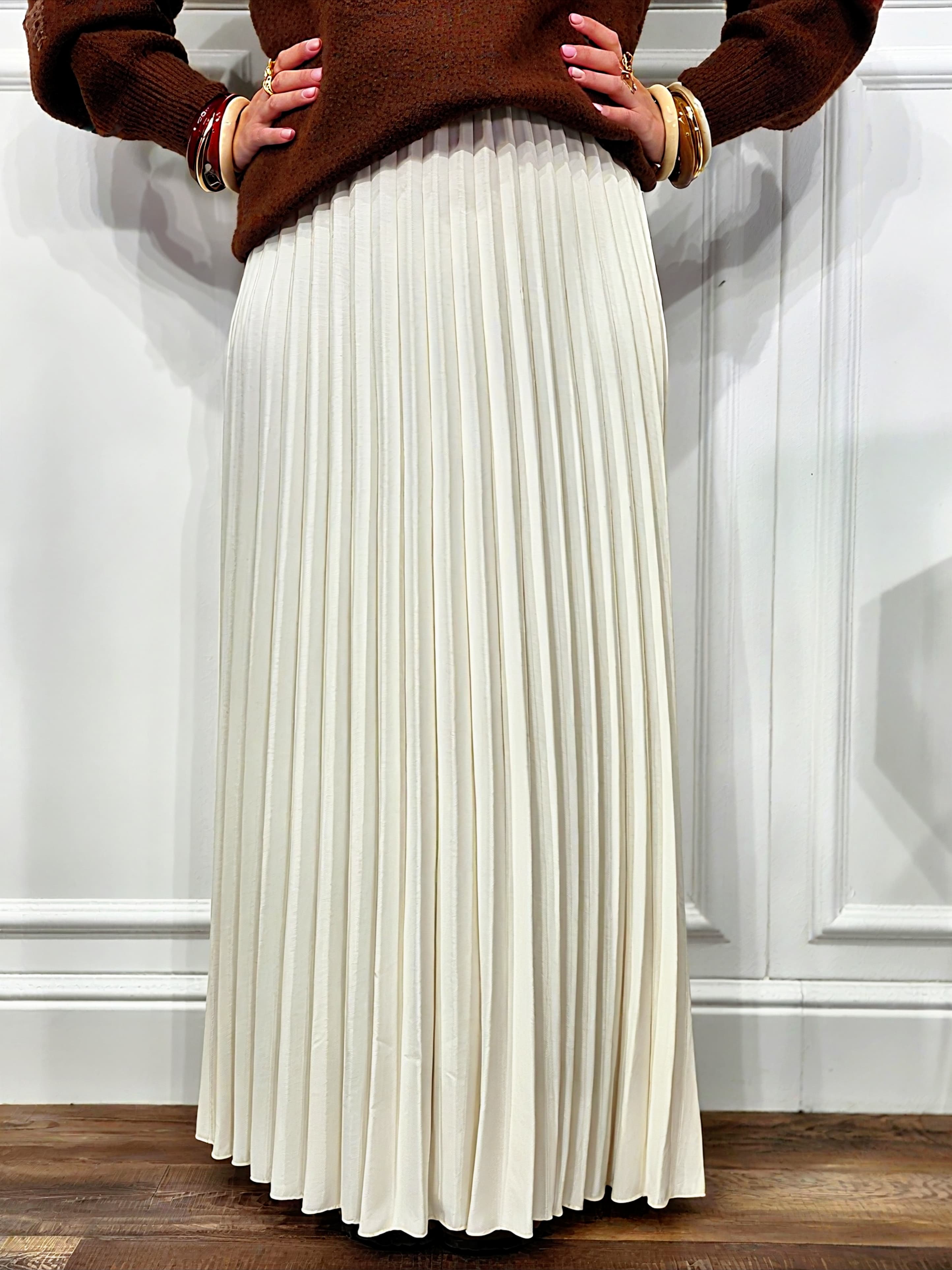 Gonna lunga a pieghe con plissé regolare e fascia elasticizzata in vita, comoda e versatile. Il tessuto fluido e la silhouette leggera la rendono perfetta sia per look casual con maglioni over, sia per outfit più eleganti con camicie o top strutturati.