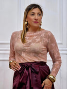 Maglia in pizzo trasparente con delicato motivo floreale e scollatura a barca che valorizza collo e spalle con grazia. La manica lunga e il tessuto elasticizzato rendono il capo confortevole, elegante e femminile.