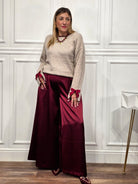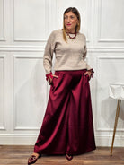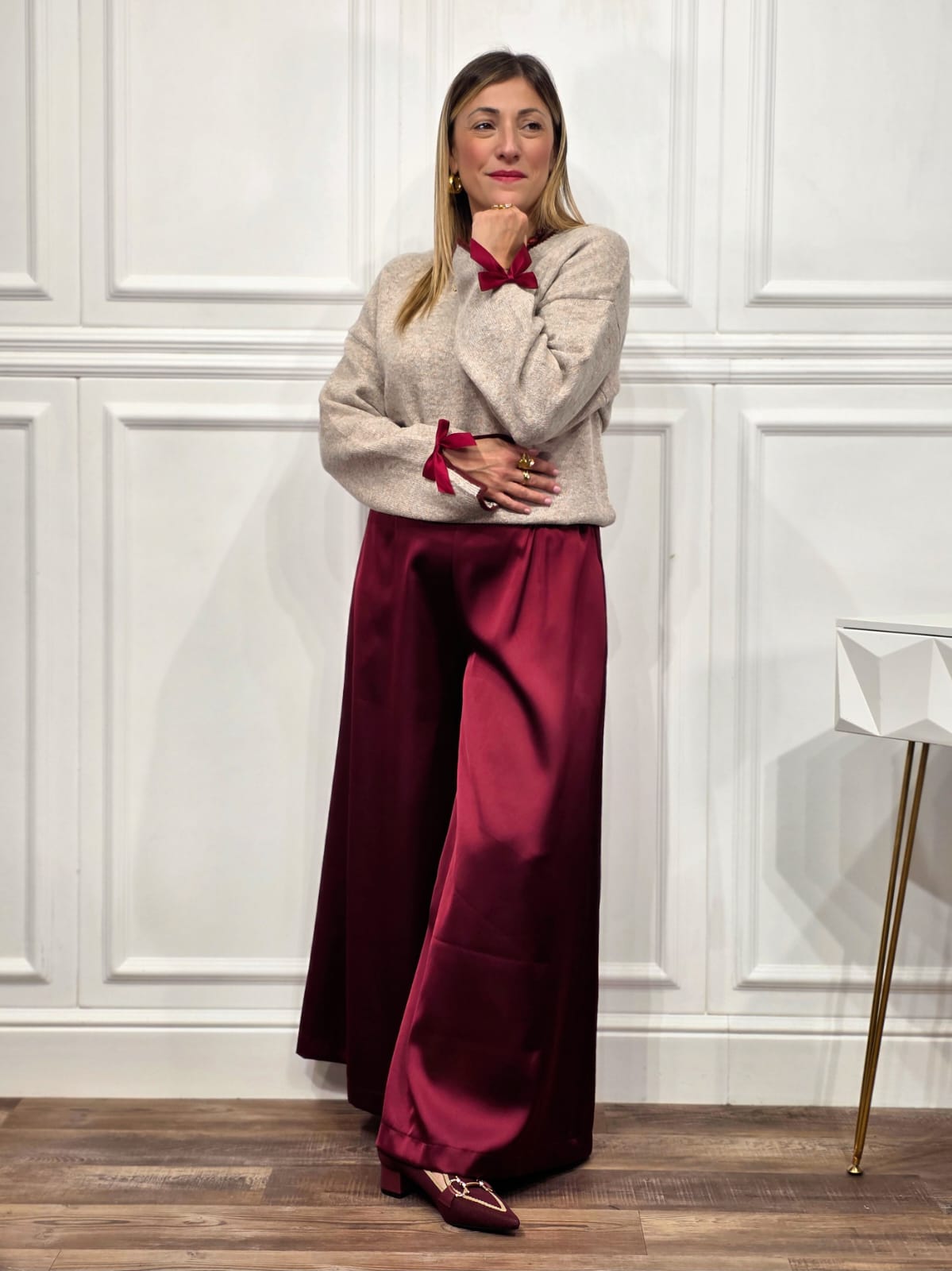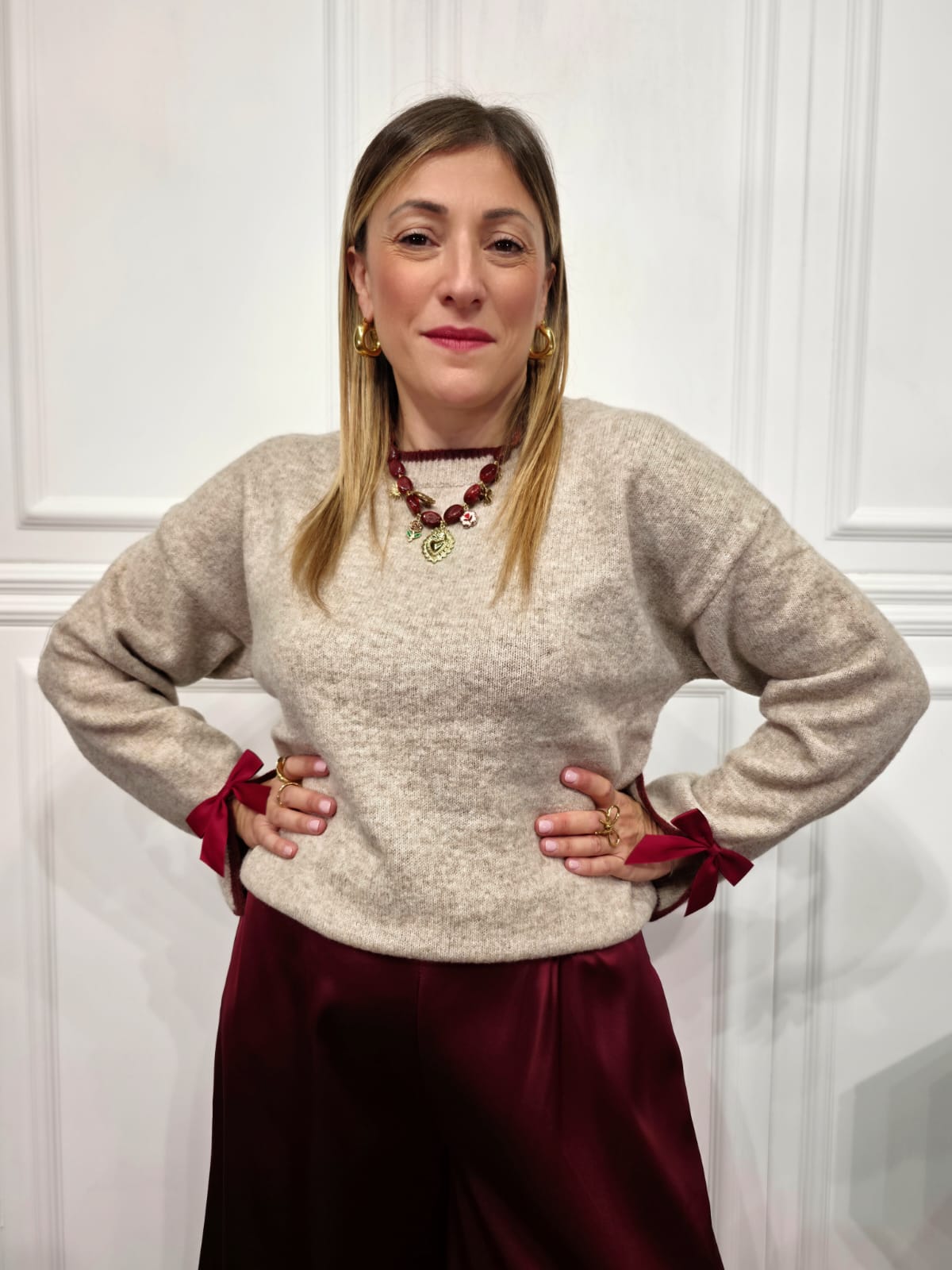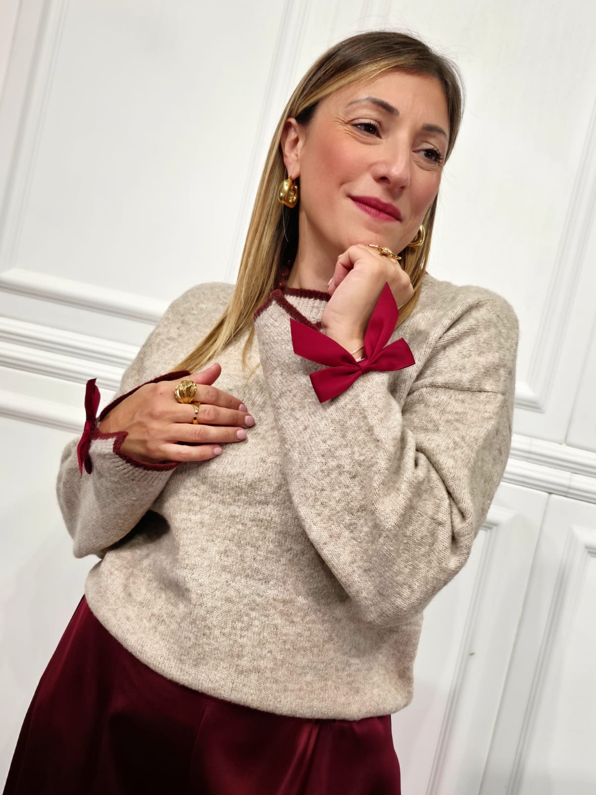 Pull a girocollo in morbida maglia con spacchetti laterali e graziosi fiocchi in raso applicati sui polsi.