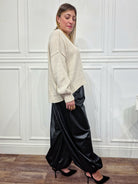 Maglia paricollo con linea morbida e fondo asimmetrico, ideale per donare movimento e un tocco moderno al look. Versatile e confortevole, si adatta facilmente a diverse occasioni.