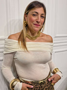 Maglia a maniche lunghe con scollo bardot, realizzata in cotone elasticizzato per un fit confortevole e aderente. Femminile e versatile, mette in risalto le spalle con eleganza.